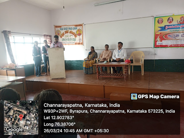 On 26-03-2024 at 10.30am, A special lecture programme titled “Pada Sampattu” organised by The Department of Kannada. A programme commence with invocation by Kum. Apoorva, Mrs. Niroosha M R Head, Department of Kannada welcomed the gathering.